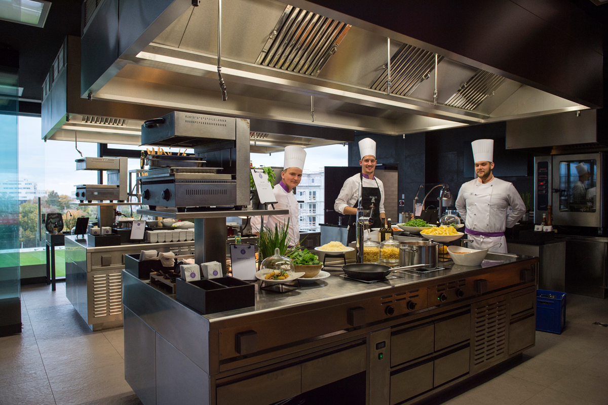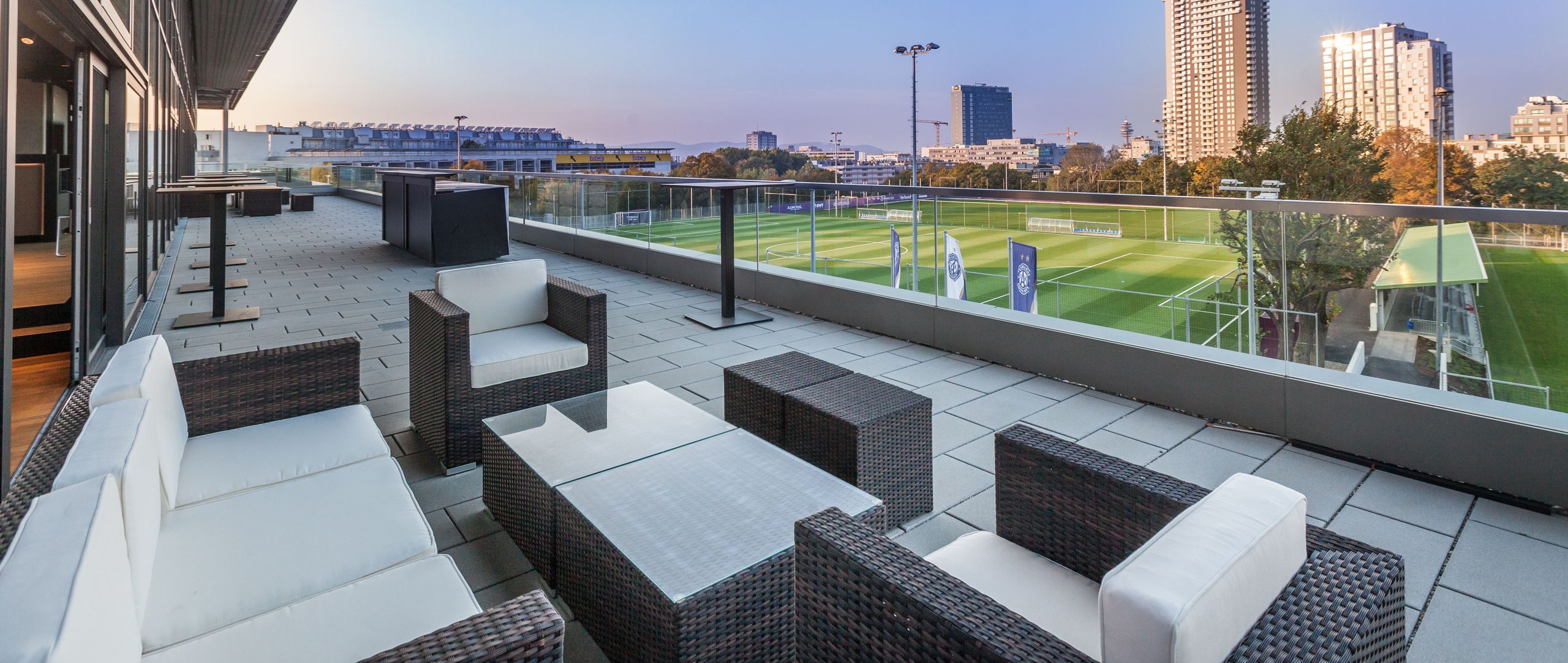 Unsere Glasfronten sorgen für natürlichen Lichteinfall und bringen das Stadionfeeling in den Innenbereich. Gleichzeitig ermöglichen sie einen phänomenalen Blick auf den Kahlenberg im Norden und den Schneeberg im Süden. Ein weiteres Highlight ist unsere großräumige Showküche im Festsaal Sindelar, die mit kulinarischen Köstlichkeiten begeistert und alle Herzen höherschlagen lässt.